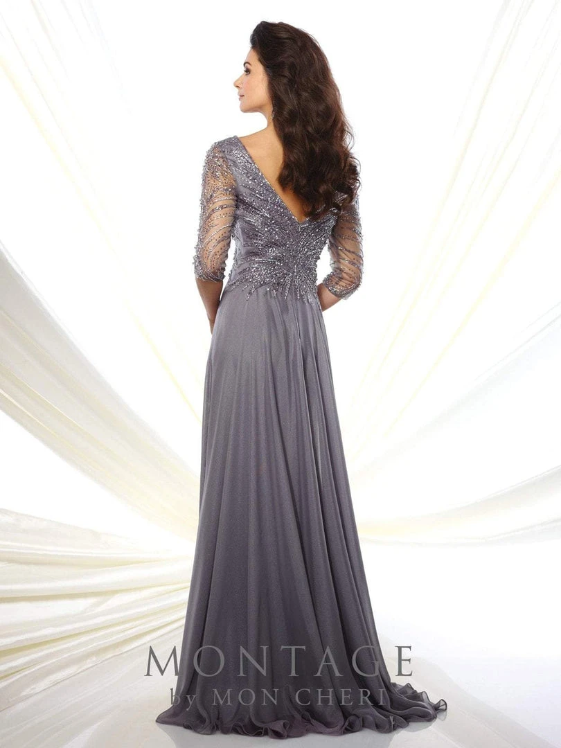 This long gown is made of diamond chiffon fabric with hand-beaded quarter length sleeves. It has a front and back V-neckline with bodice embellished with beading. The skirt flares a full length A-line silhouette with a sweep train finish. Model is wearing Gray/Heather color.