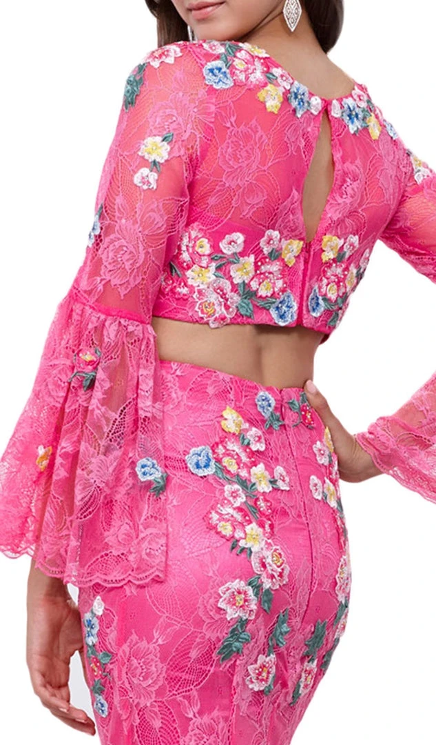 | Details: | Two-piece dress, Round neckline, Flared long sleeves, Lace and floral embroidery, Mermaid skirt, Back with keyhole opening, Zipper closure |