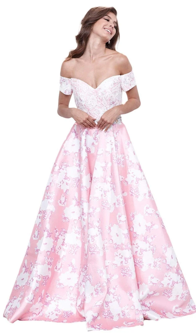 Classy and refreshing, bloom with loveliness in this detailed Nox Anabel 8301 creation. Featuring an off-shoulder bodice of lace details, this beauty shows off an embellished waistband. The full A-line skirt traverses to the ground in subtle floral print. This gorgeous Nox Anabel masterpiece will let you celebrate that divine feminine beauty!