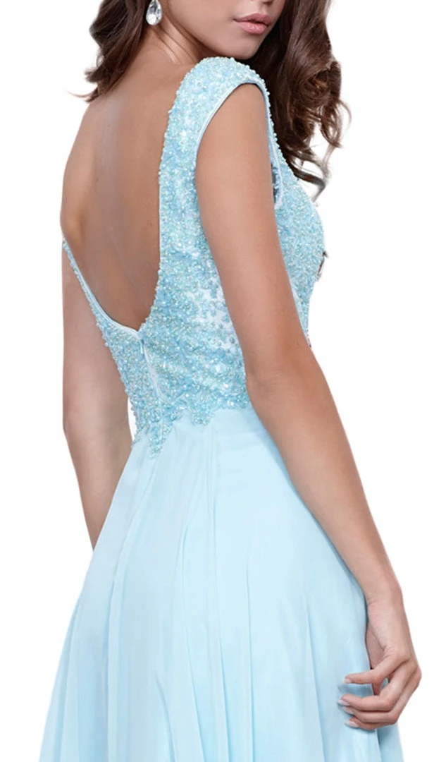 Style yourself to exude that utter sophistication in this Nox Anabel 8302 creation. This elegant chiffon dress parades in a sleeveless v-neckline with the bodice spruced with bead embellishments. Made of a vibrant spectacle with its rich fabric, the dress reveals a subtle open back, finishing in a graceful A-line skirt. Unveil an exceptional flair in this gorgeously crafted Nox Anabel masterpiece.
