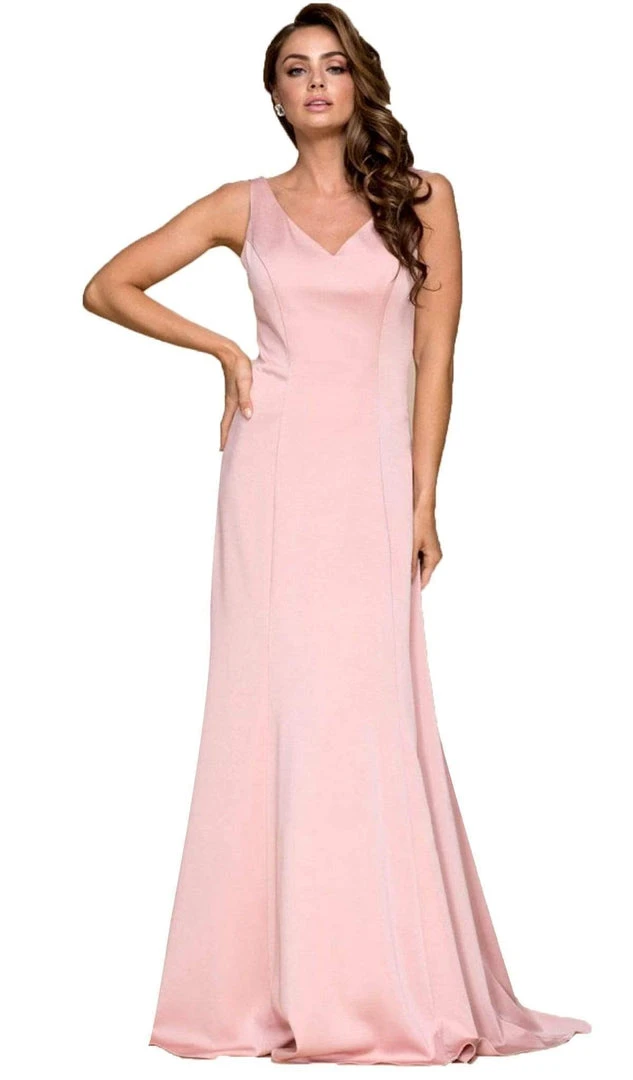 Nox Anabel Q011 brings a sleek vibe to formalwear with this standout dress. This sleeveless piece showcases a V-neckline with sleek bodice styled with a V-back and a zipper closure. The A-line skirt runs in full length and finishes with a mini train. Look and feel glamorous in this Nox Anabel dress. Model is wearing Rose color.