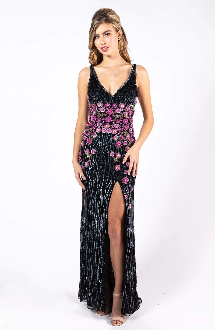 Enter the party and do that walk of a regal beauty in Primavera Couture 3238. Envisions in a sleeveless, plunging V-neckline with fitted bodice adorned with contrasting colored floral embellishments. The back flaunts a low V-cut and the skirt fashions a full length sheath skirt with a high slit and sweep train. Surround yourself with sparkle of glamour when you walk in this dazzling Primavera Couture dress.