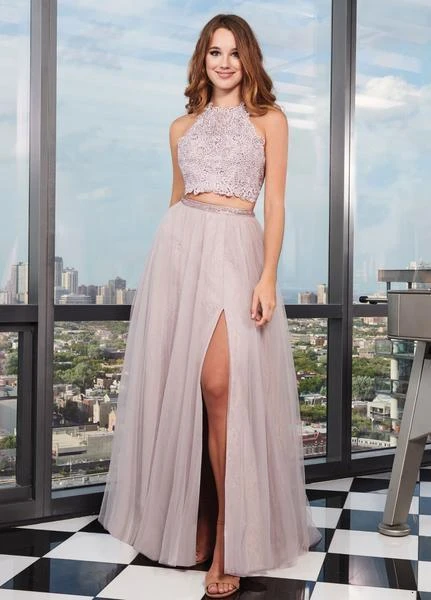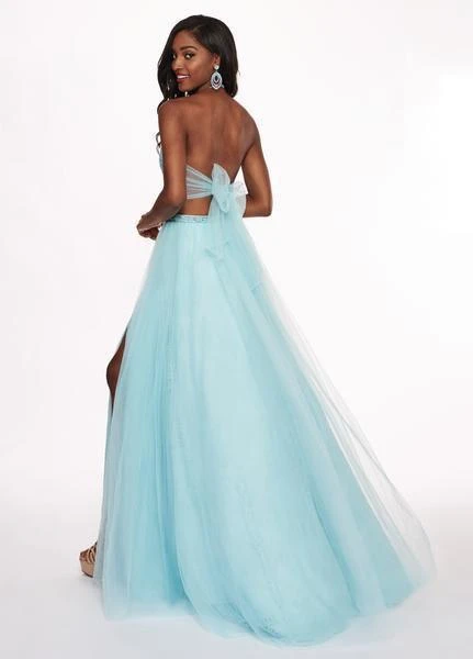 Wow everyone in this sophisticated dress by Rachel Allan 6437. This two piece ensemble enchants in a sleeveless, halter neckline crop top made of embroidered lace and accented with a bow at the back. The tulle A-line skirt runs in full length hem and is styled with a front high slit. Portray the rich variety in design of this Rachel Allan look.