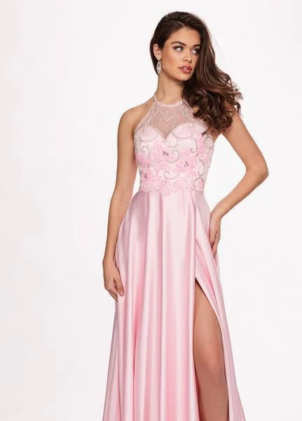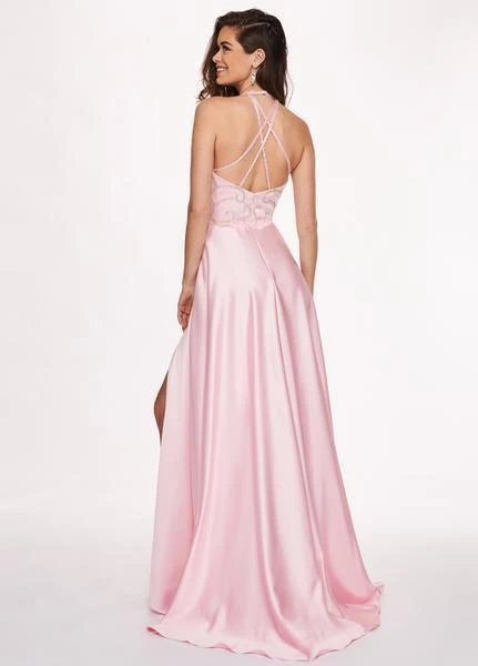 Turn heads in this long dress by Rachel Allan 6487. Brandishes in a sleeveless, halter neckline with fitted bodice ornate with glittering beading. The dress features a strappy back while the satin A-line skirt charms in a slit and sweep train finish. Charm everyone from all angles as you shine all night long in this Rachel Allan masterpiece.