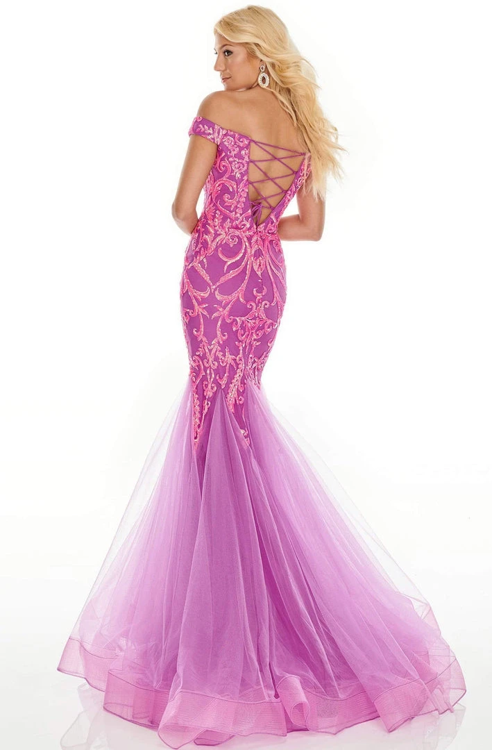 Mesmerize everyone in this charming dress by Rachel Allan Prom 7199. This stunner features a plunging off-shoulder neckline with sheer inset at mid-bust. The fitted bodice is adorned with sequins and beading. It has a lace up back while the tulle skirt forms a mermaid silhouette with a horsehair hemline. This Rachel Allan Prom dress is sure to make you the darling of the party!