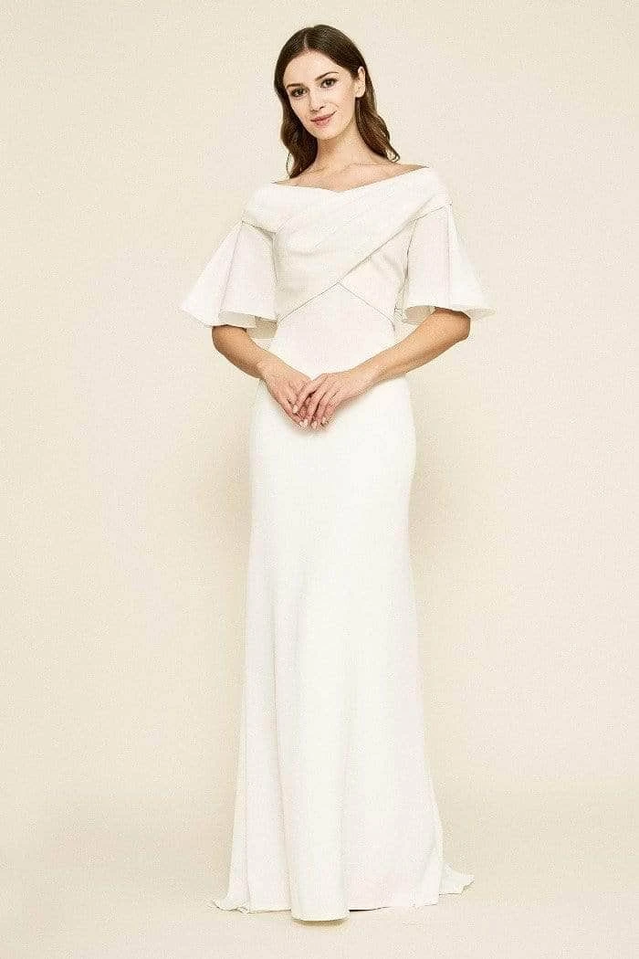 Exquisitely tailored in elegant crepe fabric, this fascinating piece features crisscross style at the bodice with off-shoulder neckline and draping bell sleeves. The skirt sculpts charmingly from the hips before it flares subtly and finishes at floor length. Model is wearing Ivory color.