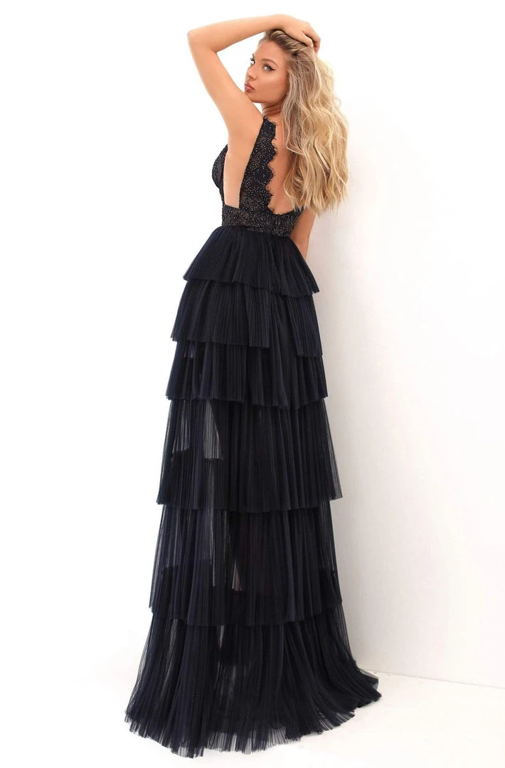 Make a statement with this Tarik Ediz 50705. This sleeveless masterpiece features a plunging V-neckline, bead lace bodice, under bust and side cut-out, scoop back, and a zipper closure. The tiered A-Line silhouette skirt features a high-low length and a sweep train. This Tarik Ediz is sure to be an attention-grabber in any occasion. Model is wearing black.