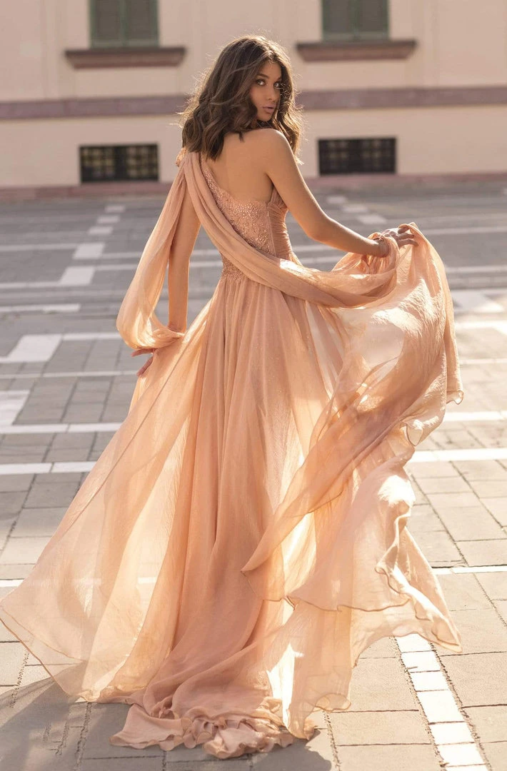 You will be an enchanting beauty in this wonderful Tarik Ediz 93924 masterpiece. Designed with ruching details, the fitted bodice showcases an asymmetrical neckline, wide waistband and a peek-a-boo cutout. The single shoulder strap adorns bow accent as the back is designed with beaded lace and eyelash trims. The fitted leg pants are also made in beaded lace as the a-line overskirt is tailored in chiffon which dramatically finishes with a sweep train. This Tarik Ediz creation will definitely bring out the goddess in you!