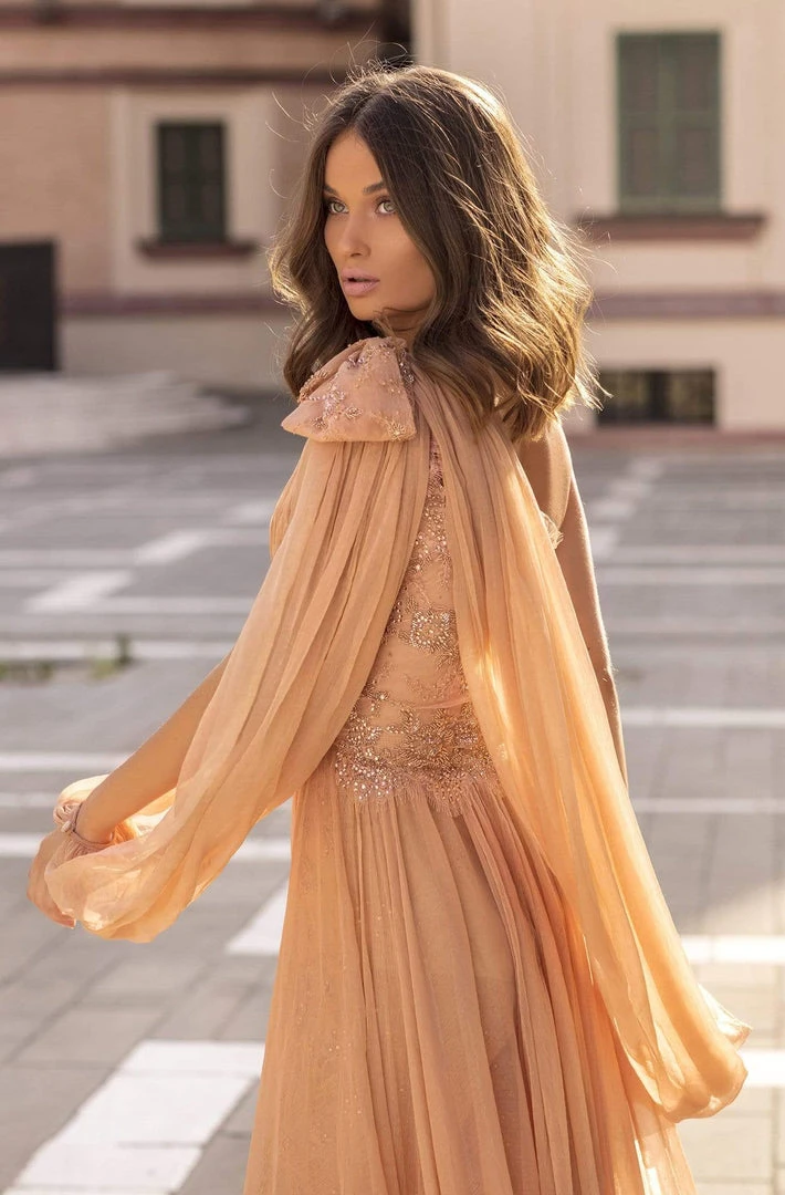 | Details: | Chiffon , Ruched Bodice and Waist, Front Cutout, Beaded Lace Pants, Floor Length, Side Zipper Closure, Sweep Train |
