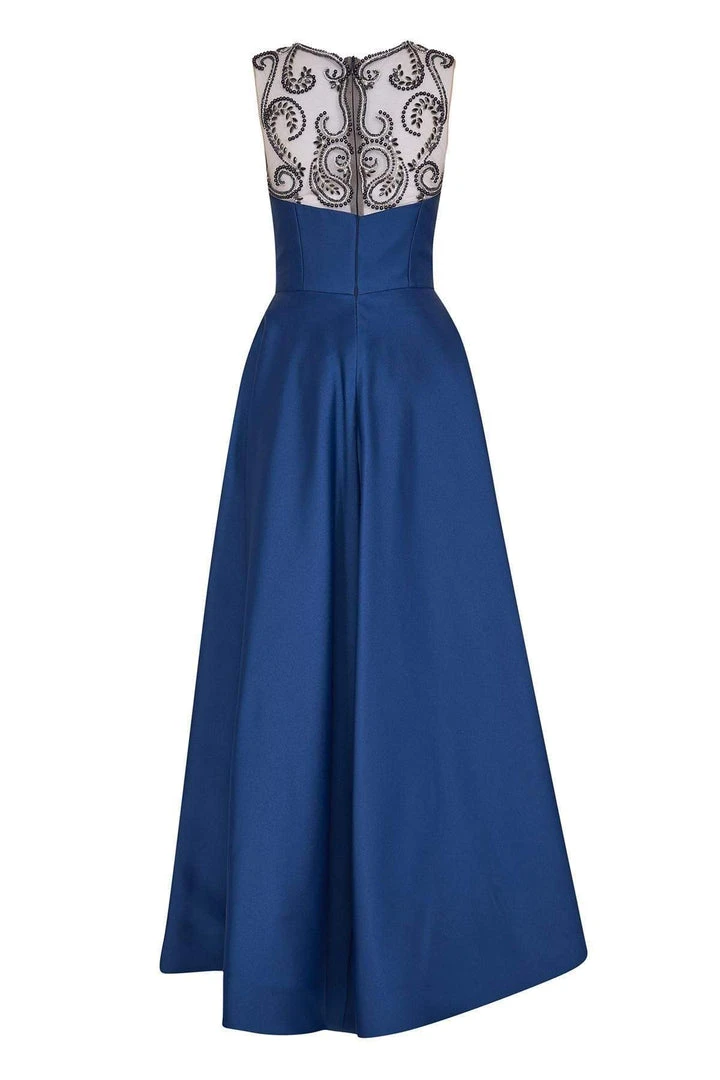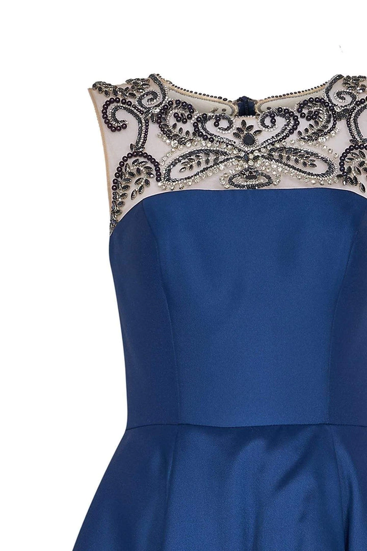 | Details: | Sleeveless, Bead accents, Sheer fabric, A-line skirt, Fitted bodice |