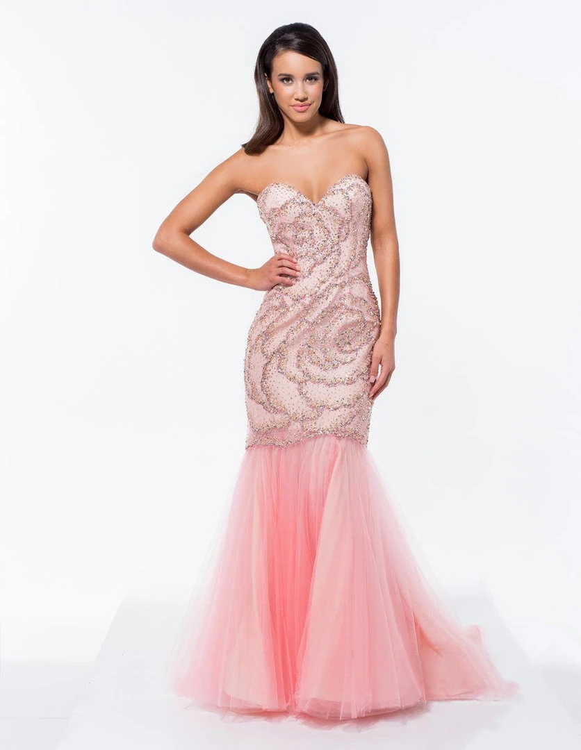 Surround yourself with sparkle of glamour when you walk in this dazzling Terani Couture 151P0110A long gown. This exceptional gown features a strapless sweetheart neckline. An extravagant rosette motif sprawls across the curve-kissing bodice and luxurious beads add glamour to this outfit. This elegant design comes with a fitted shape and drop waistline to easily flaunt your curves. The flared skirt is bolstered by layer upon layer of ultra-fine tulle fabric emphasizing a mermaid silhouette. This gown finishes to a floor length hem. The back is mid open and has center zipper closure. Dazzle in beauty wearing this Terani Couture creation. Model is wearing Blush/Nude color.