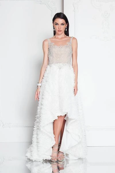 Steal the show when you walk in in this exceptional Terani Couture 1811P5796 creation. Beautifully crusted with silver beadwork designed in a scroll and lattice motif, this enticing piece shows an illusion bateau over a sweetheart neckline. Mimicking the embellishments of the bodice, the illusion scoop back is ornamented with beadwork as well as its basque details. The A-line skirt is adorned with shirred chiffon that softly flares down into a high low hemline and a sweeping train. Win over the hearts of many in this charming Terani Couture masterpiece.