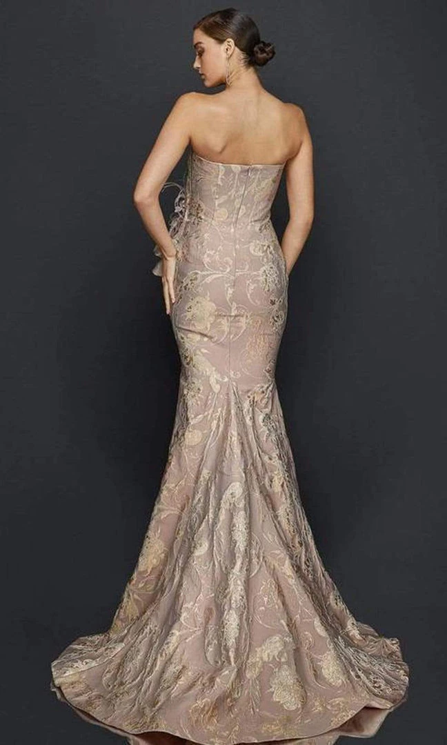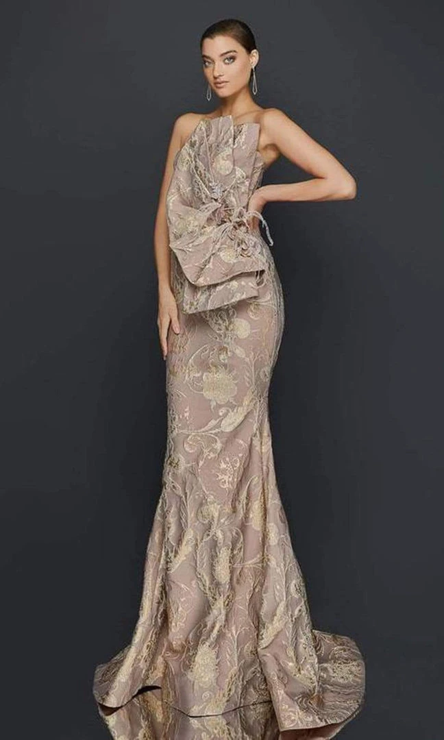 This Jacquard gown gives off glamour vibes with its stunning pleat fan accent that highlights the bodice. Fashions a strapless, straight across neckline with fitted bodice and a mid-open back. The skirt tapers at the thighs and flares at the bottom and finishes in a dramatic train.