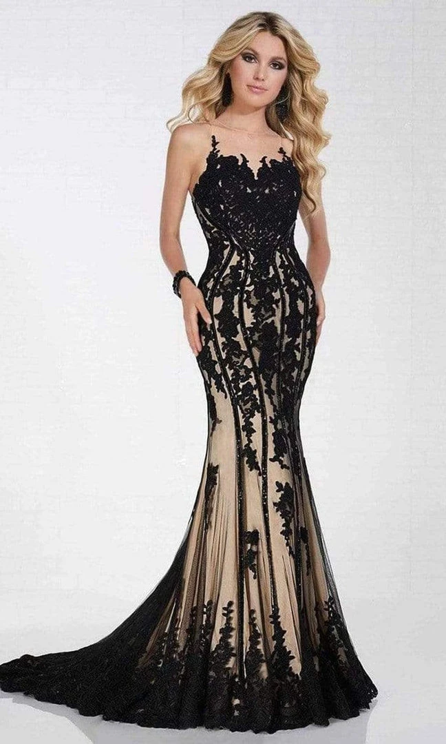 Charm everyone by the perfection of your elegant prowess in this enticingly ornate Tiffany Designs 16274 creation. Embellished with contrasting lace appliques that harmoniously blend with vertically stringed sequins, this glamorous piece flaunts an illusion jewel over a sweetheart neckline on a sleeveless bodice. Tailored with a sheer racerback, this glamorous ensemble is amazingly textured with adornments as it magnificently ends in a scallop lace bordered mermaid flourish with a matching court train. Flatter all your finest assets as you exude beauty in this Tiffany Designs masterpiece. Model is wearing the Black/Nude color.