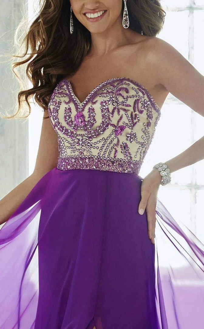| Details: | Strapless, Sweetheart, Embellished bodice, Back zip closure, Semi open back, High slit |