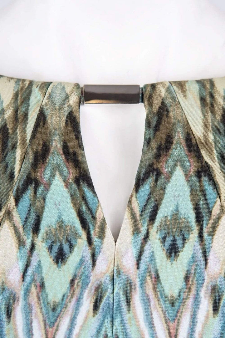Feel glamourous in this Gabby Skye 18986M. The multi-print design dress features a sleeveless, bateau neckline with keyhole detail, and an A-line skirt. Back zipper closure. A sure winner from Gabby Skye creation!