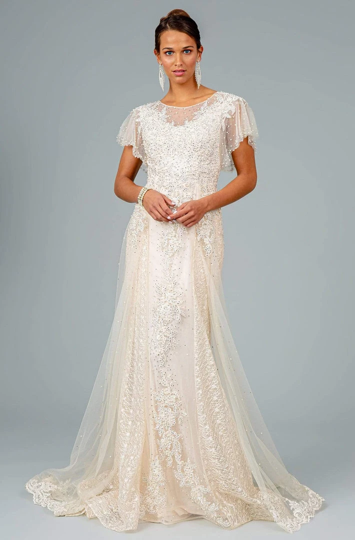 | Details: | Beaded, Embroidered Lace, Short Flutter Sleeves, Illusion Full Back, Back Zipper Closure, Sheer Overskirt, Sweep Train |