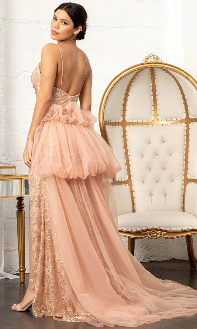 Turn yourself into a head-turning sensation by slipping into this utterly fetching GLS by Gloria GL3004. Shimmers graciously in a glittered figure-hugging dress, this beauty is styled in a sleeveless fitted bodice with low scoop neckline supported by thin straps leading to an alluring open back secured by a zipper closure. The dress is accented with interesting asymmetrical cutouts across the bodice enclosed by sheer mesh. A high leg slit compliments the skirt as it slips into beautiful sheath silhouette with puffy sheer tail at the back for added drama and gracefully ends with a court train. This GLS by Gloria collection is sure to get you noticed. Models are wearing Rose Gold and Champagne colors.
