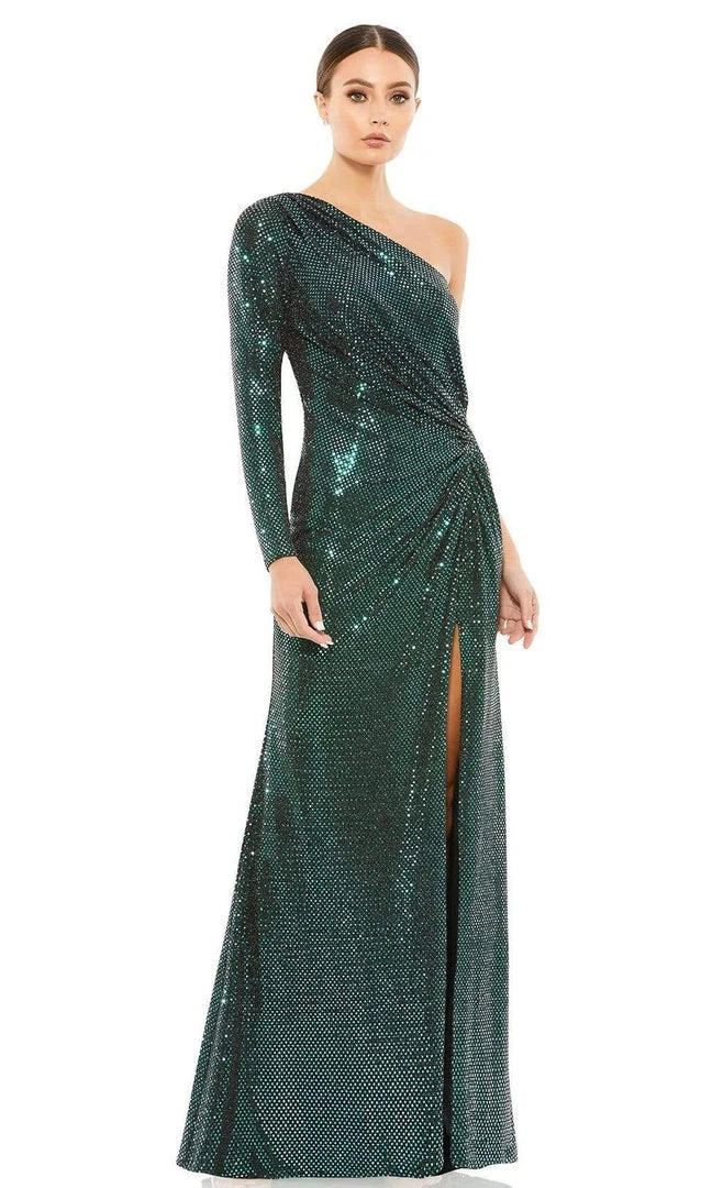 Flaunt your best assets in a scintillating dress from Ieena Duggal 12501. This ensemble is designed in sequins as the fitted bodice features an asymmetrical neckline and one shoulder long sleeve. Elegantly ornate with gathered ruching, the back shows off an asymmetric mid-open cut and has a zipper closure. To complete this look the sheath skirt is tailored with a high-leg slit for a sexier appeal. Dive into a divine event in this luxe Ieena Duggal creation.