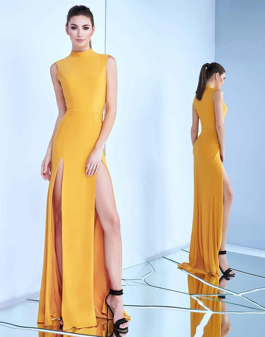 Showcase those irresistibly tantalizing assets in this sultry yet classy Ieena for Mac Duggal 25034 creation. Beautifully sculpted with fitting seams for that hourglass look, this alluring piece shows a sleeveless bodice topped with a high neckline with a blend of a full back. Sensationally molding down every curve while being cinched with a slim inset band, the sheath skirt unveils two thigh high slits as it slides down to a full-length hemline and a dazzling sweep of train. Elevate your confidence and charismatic vibe in this glamorous Ieena for Mac Duggal masterpiece. Models are wearing the Emerald, Gold, Royal, Rose Pink, Black and Red colors.