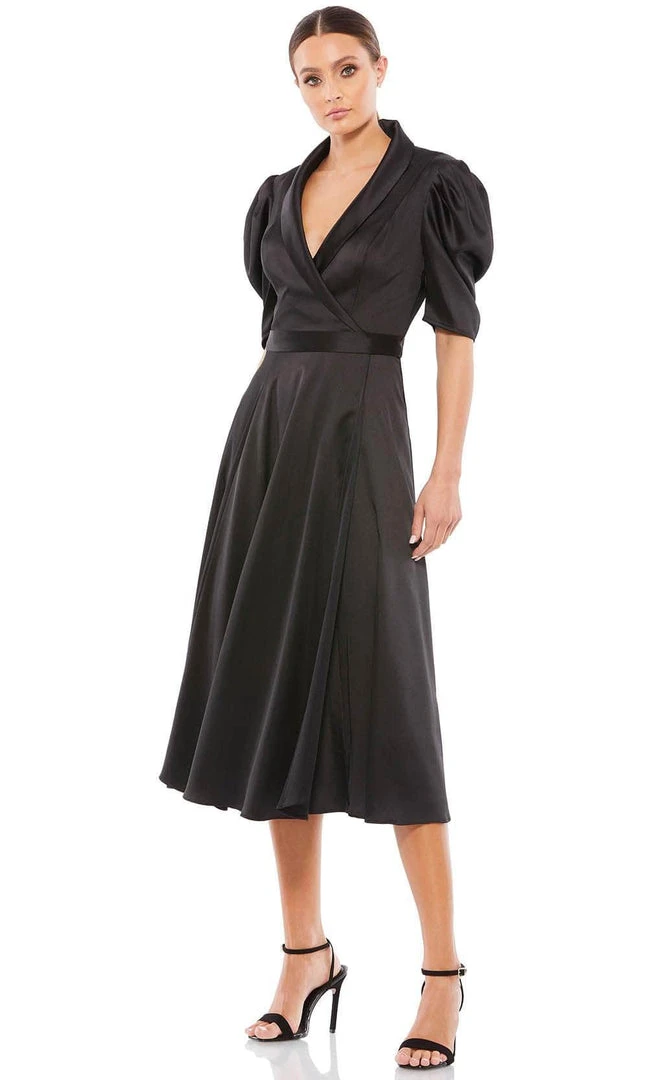 Envision the ideal evening in this evocative formal dress by Ieena Duggal 26628. This elegant piece displays a faux-wrap style bodice with an elbow puffed sleeve and satin collared V neckline. The waist is accented with a satin wide waistband while the fully enclosed back is secured by a zipper closure. This pleated A-line skirt flourishes a tea-length hemline. Fall in love when you slip on this Ieena Duggal creation. Model is wearing the Black color.