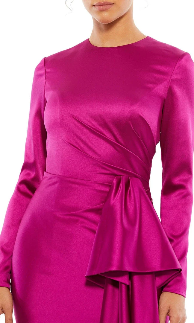 Make a memorable splash at your upscale evening in this lux formal creation by Ieena Duggal 26644. This fitted dress features a form-fitting silhouette with a jewel neckline and long sleeves. The side is designed with ruching and shows a long side peplum detail. A center zipper closure secures the full back while the sheath skirt flourishes a mid-thigh asymmetric hemline. Take your seat on the throne in a queenly dress from Ieena Duggal. Exquisite attention to detail is the hallmark of Mac Duggal dresses. Mac Duggal dresses encapsulate the very essence of the women who wear them, reflecting their confidence, feminine power, and inner beauty.