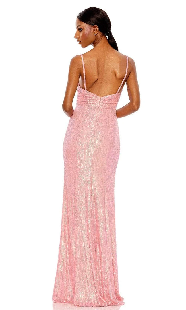 Light up the night in this eye-catching Mac Duggal 26945. Dazzling in iridescent sequins, this sleeveless gown shapes a lovely column silhouette. A plunging neckline and spaghetti straps accent a faux wrap bodice, with pin tucked pleats for added structure. This Mac Duggal evening gown will not let anyone miss your grand entrance.
