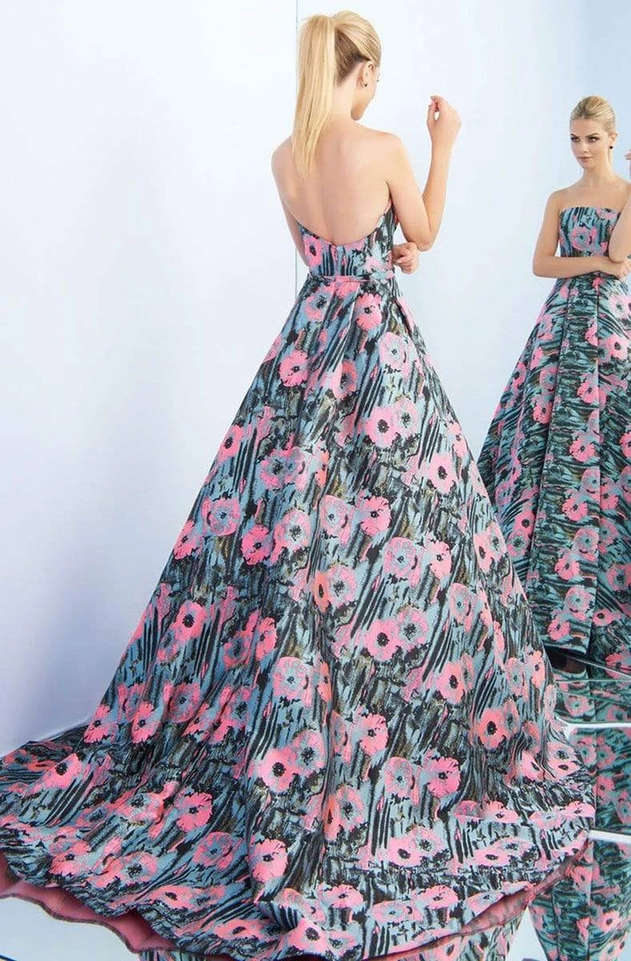 Enchanting and timeless, this magical evening gown by Ieena for Mac Duggal 55213 is a lovely look for any party. The strapless bodice is glamorously lined with princess seams for a subtle and chic look. Fashioned from enchanting floral printed fabric this fabulous ensemble drapes to the full-length A-line silhouette hem in lavish pleated waves, complete with wide train. Look sophisticated and mature in this simple yet chic Ieena for Mac Duggal masterpiece.