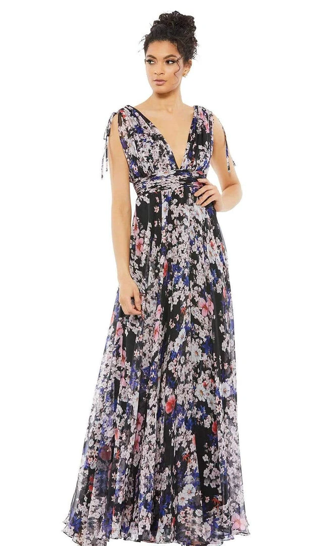 Be the delight of everyones eyes in this Ieena Duggal 55414 dress. This dress showcases a plunging V-neckline in a floral printed bodice with empire waist. Revealing an A-line silhouette, this also shows a V back with back zipper closure to complete the look. Look gorgeous as you wear this Ieena Duggal creation. Model is wearing Black and Multi-Color.