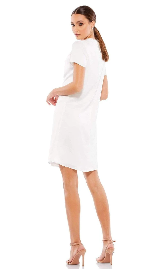 Dress to impress with this Mac Duggal 55698. This gives a comfy feeling to the wearer as it is made with soft fabric. It features short sleeves and jewel neckline on a loose bodice of a mini dress. This Mac Duggal creation is truly remarkable!