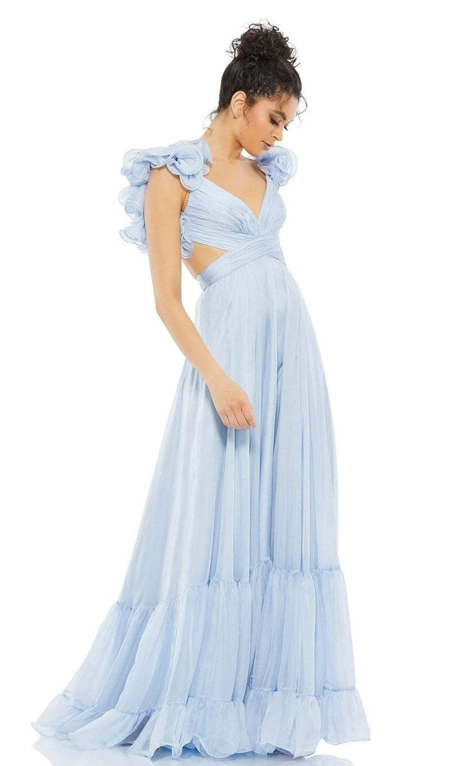 Flourish a romantic flair as you walk down the red carpet in this Ieena Duggal 67911 creation. Festooned with thick ruffle details on the shoulders, this dress parades a v-neckline on a pleat ornate bodice. Side cutouts accent the midriff as a lace up detail nips the back. Flaunting a crisscross waist design, the tiered skirt streams into a fluttering finish with a train. Impress everyone with the sophistication on this Mac Duggal masterpiece.