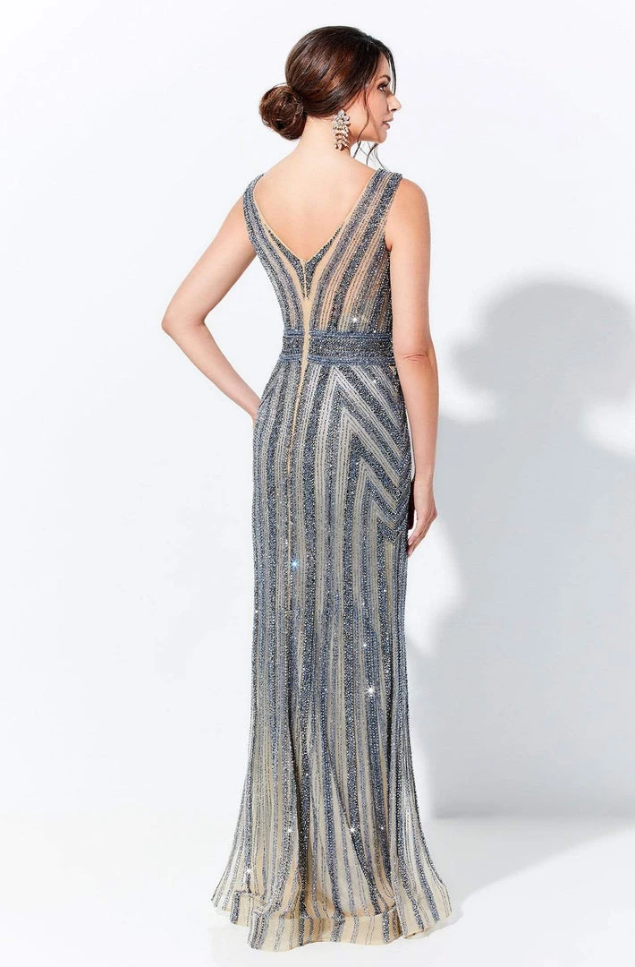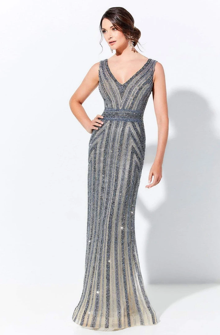 | Details: | Sleeveless, Beads, Nude inset, Fitted bodice, Long column dress, V-back, Back zipper, Hard hemline |