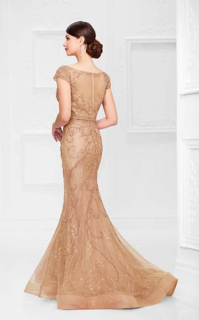 Full length hand-beaded tulle mermaid gown with illusion cap sleeves and bateau neckline, sweetheart bodice with beaded natural waist, illusion back, horsehair hemline, back zipper closure.