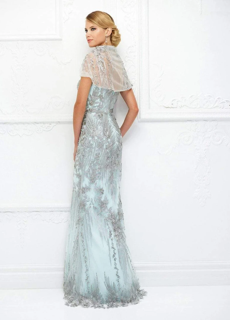 This strapless tulle and metallic lace sheath is decked with intricate allover beading that comes with a matching tapered detachable wrap. The dress features a flattering sweetheart neckline, a natural waistline, and a full length skirt that finishes in a slight sweep train. A detachable matching wrap is included.