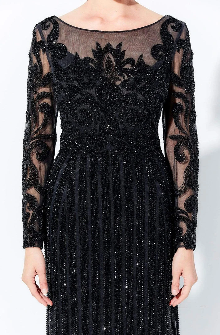 Look totally amazing in this shimmering Ivonne D by Mon Cheri 120D11 evening dress. An illusion wide scoop neckline and slender sheer long sleeves frame the fitted bodice, complemented with sheer full zipped up back. The whole dress is designed in lace embroideries with stone accents which provide the shimmering effect. The skirt features a sheath silhouette which exquisitely falls to a full length hemline, completed with a sweep train. Be the center of attention in this glamorous Ivonne D by Mon Cheri ensemble. Find more mother of the bride dresses!