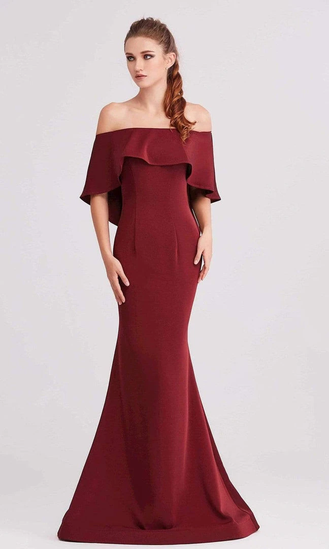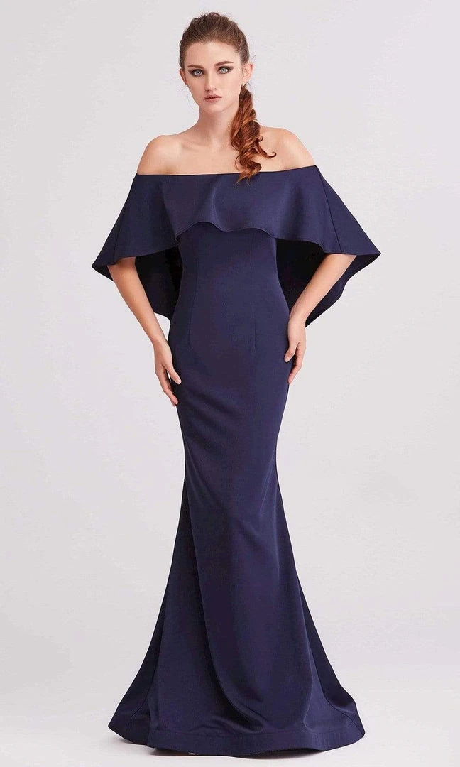 | Details: | Off shoulder overlay, Fitted bodice, Mermaid skirt, Sweep train |