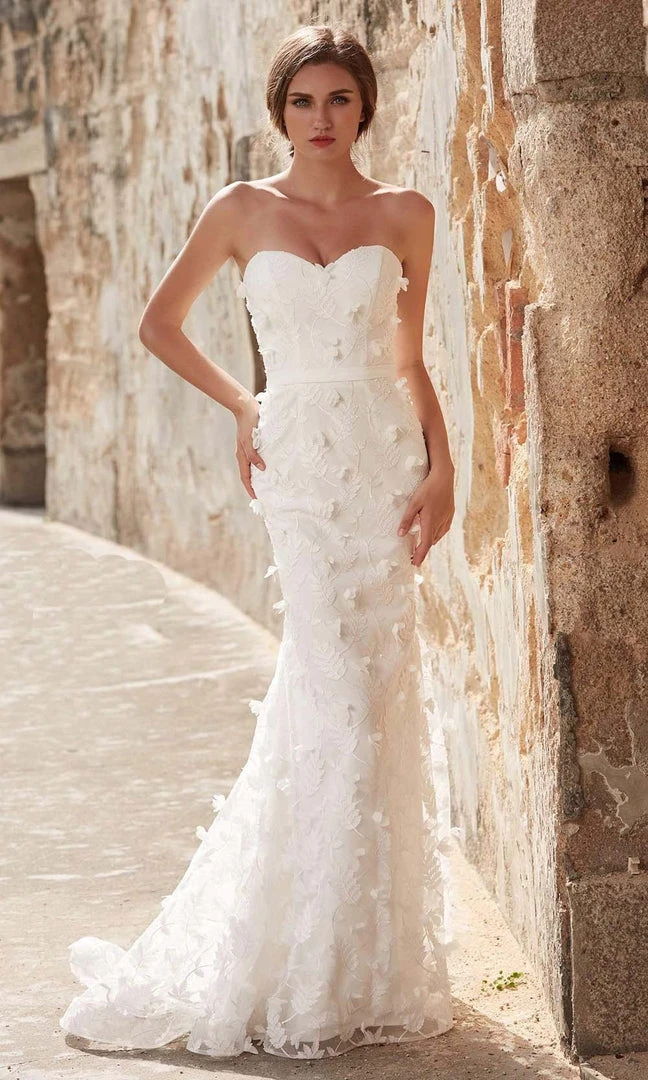 Strike a pose as you enter the room in this exquisite dress by J’Adore J15020. This floral applique gown appeals in a strapless, sweetheart neckline with a fitted bodice. The dress is wrapped in a thin band and the back has a zipper closure. The skirt fashions a mermaid silhouette and finishes in a sweep train. Leave everyone speechless when you enter the room in this J’Adore dress.