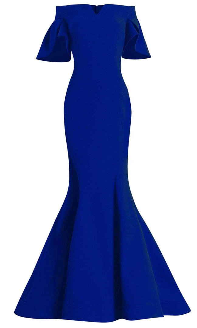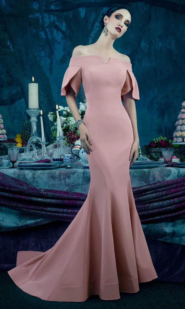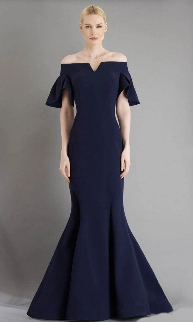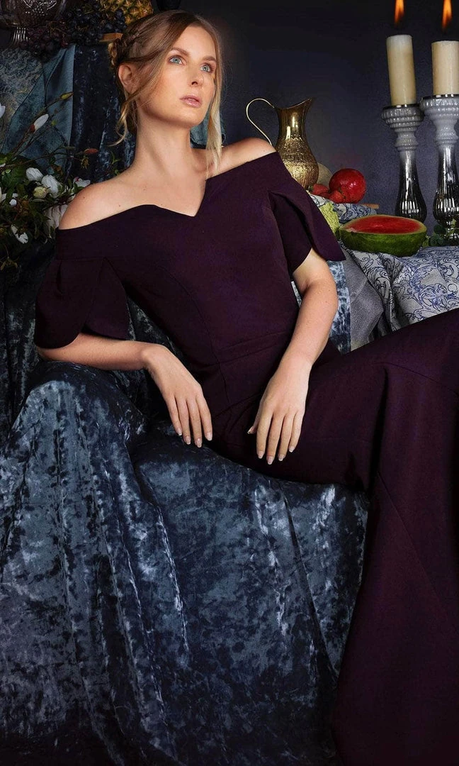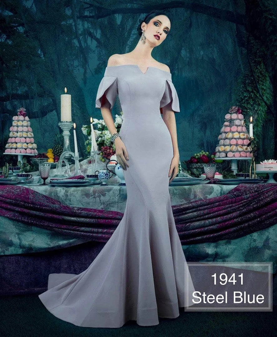 Make your fantasy come true when your cross the threshold in this Janique 1941 creation. Sculpted in a richly colored stretch crepe fabric, this beauty parades a notched off shoulder neckline with ruffled half sleeves. Partially revealing the back, the skirt attains a mermaid silhouette by flaring out from the knees into a slight sweeping train. Leave the right and lasting impression in this Janique masterpiece. Models in picture are wearing Navy, Teal, Royal, Aubergine, Blush and Steel Blue colors.