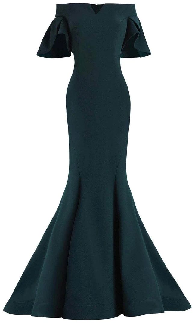 | Details: | Notched Neckline, Ruffled Half Sleeves, Mid-Open Back, Back Zipper Closure, Stretch Crepe, Sweep Train |