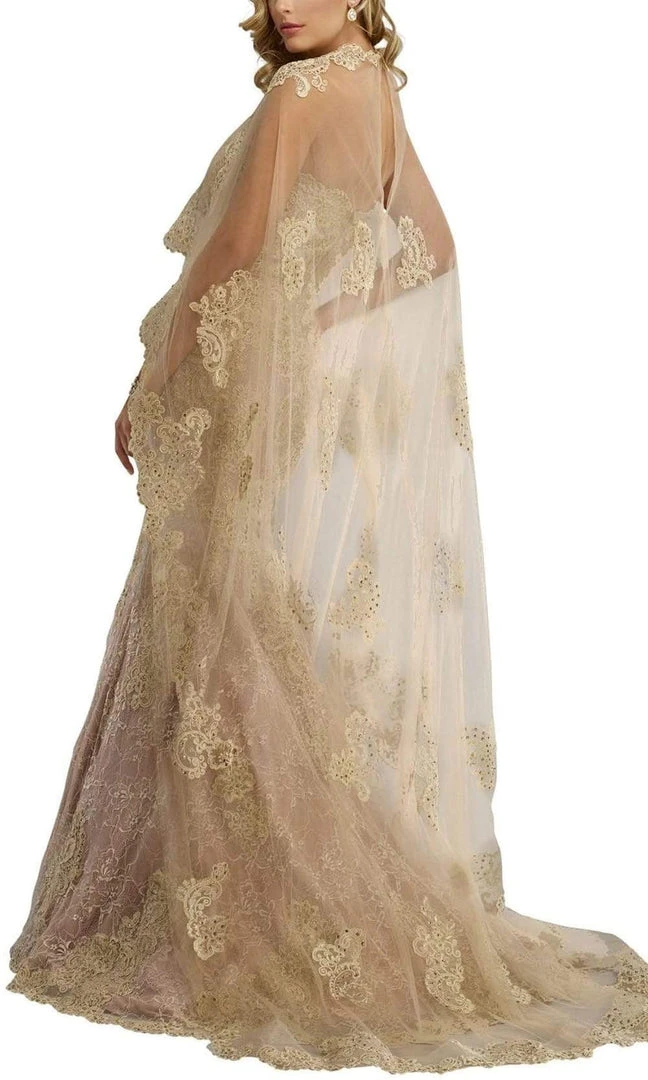 Experience admiring gazes being drawn your way with this ethereal gown by Janique W1718. This stunner exudes an old Hollywood kind of vibe with its scalloped trimmed sweetheart neckline and gorgeous open back. The bodice is stunningly contoured with the most beautiful lace fabric that continues to a delicate trumpet skirt and finishes to stunningly pool on the floor with its sweep train. This masterpiece is imperfect without its lace embroidered high-low shawl draping the tantalizing dress. Get used to mesmerizing the crowd with this timeless creation by Janique.