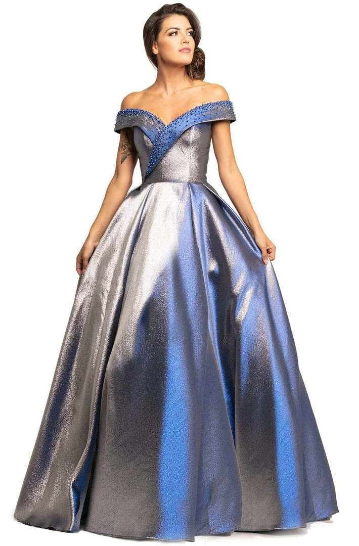 Appear like a modern princess in this stunning Johnathan Kayne 2072 masterpiece. Made in Metallic Shimmer Brocade fabric, this dress showcases a princess seamed bodice, framed with a folded off-shoulder neckline accented with pearl embellishments. Fabulous pleats design the ballgown skirt as it falls to a full length hemline. Appear in elegance with this Johnathan Kayne ensemble.