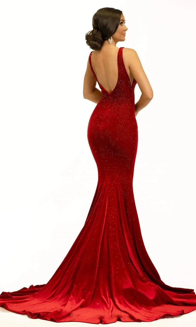 Stand out in every occasion with this Johnathan Kayne 2308 dress. This evening dress highlights a plunging V neckline in a fitted, sleeveless, and bead embellished bodice with empire waist. The skirt reveals a trumpet silhouette while the back shows a V back with back zipper closure. Steal the show in this Johnathan Kayne design.