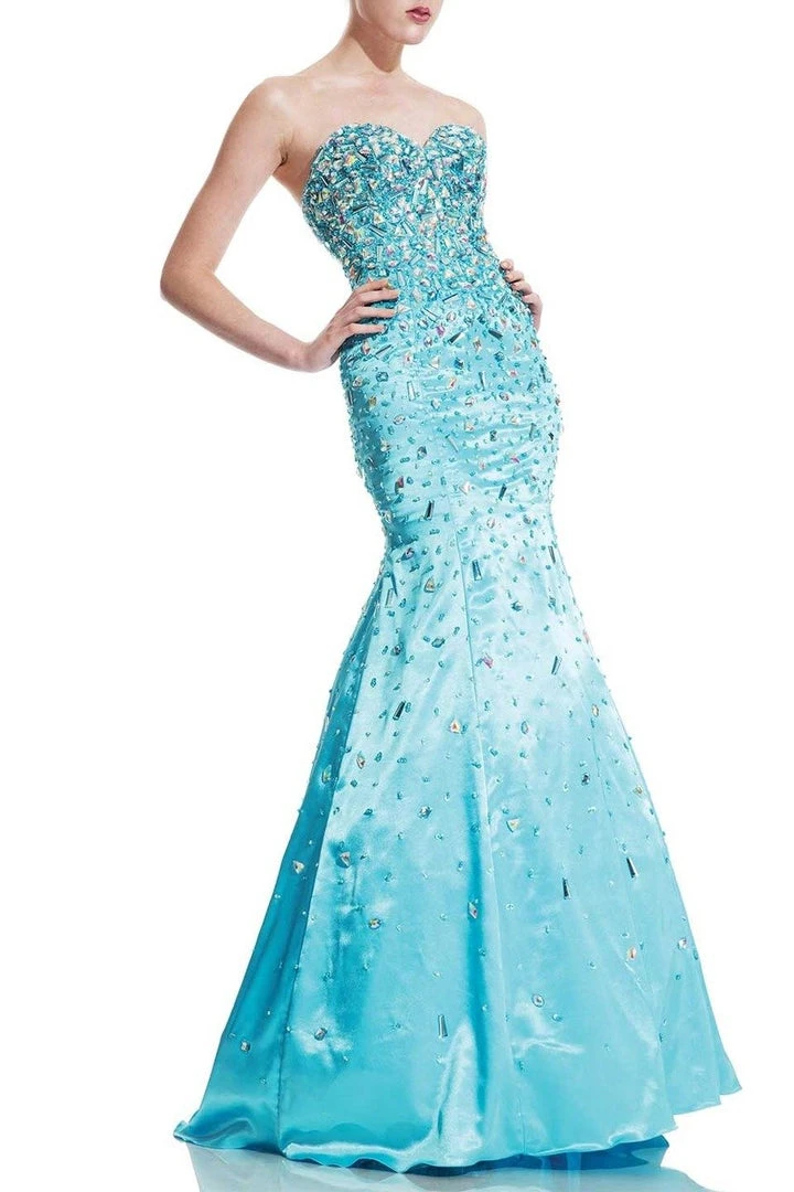 Sparkle with stunning iridescence as you bask under the limelight in this fabulous Johnathan Kayne 458 creation. Enchantingly tailored with a rich satin fabric sprinkled with chunky crystals that reflect the light, this enticing piece has a strapless sweetheart neckline coupled with a mid-open back. Constructed with extra corset boning for support, the bedazzled mermaid skirt sculpts before in flares dramatically down to a sweep of train. Dance the night away in captivating beauty in this Johnathan Kayne masterpiece.