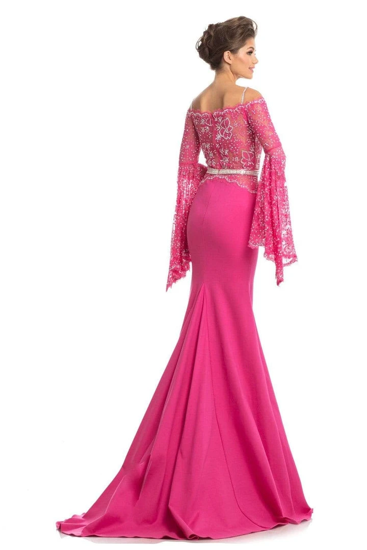 Walk into a room and be that unforgettable ethereal vision the crowd has been waiting for in this beautiful Johnathan Kayne 7244 creation. Fantastically enveloped in a delicate lace fabric over a nude lining, slender straps lead to the off-shoulder neckline accented with scalloped edged sweetheart shape. Lace bell sleeves with scattered jewels flow in soft ripples down to the fingertips. Crowned with a sparkling band defines the natural waist, delicate lace shrouds the hips as an illusion mid-open style graces the back. The contoured skirt forms a fluted and flared mermaid denouement. Celebrate this magical night as you inspire awe in this enchanting Johnathan Kayne masterpiece.