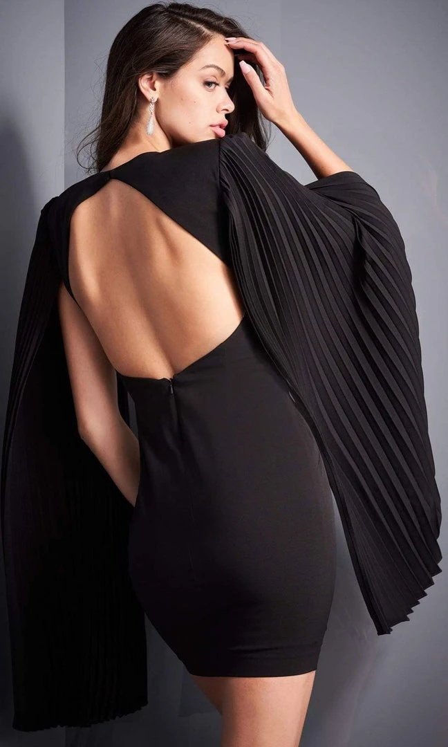 Get noticed in any crowd wearing this design by Jovani 00755. Envisions a bateau neckline with cape-like sleeves. The fitted bodice shows off a sexy open back and has a zipper closure. The skirt hugs your figure in a fitted silhouette and is tailored with a mid-thigh hem. This Jovani dress is perfect for any formal evening. Model is wearing Black color.