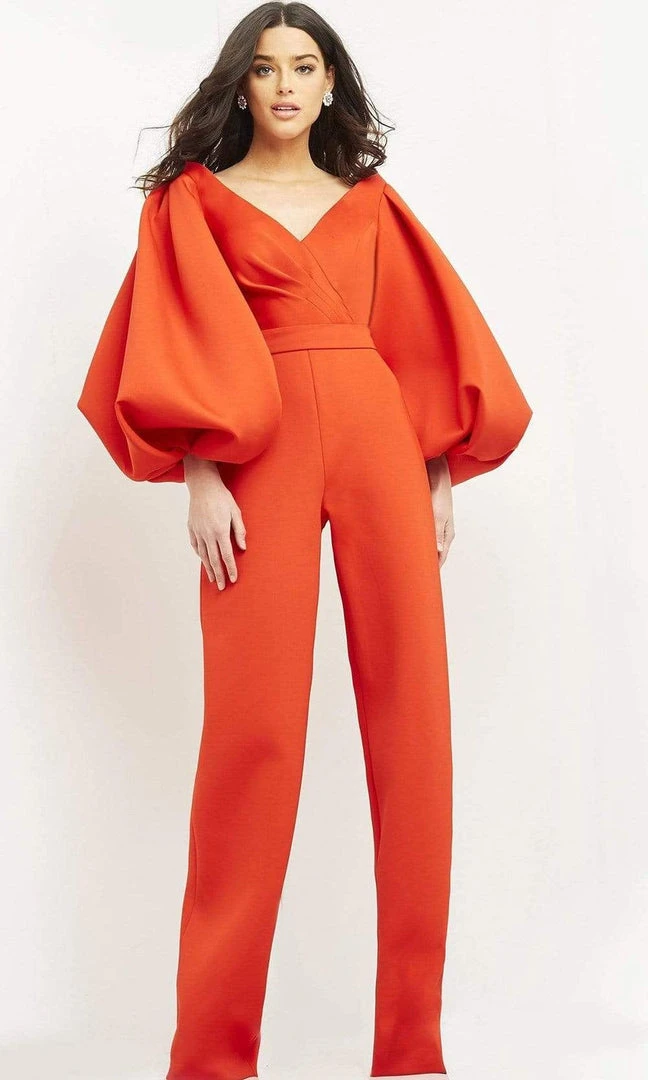 You are sure to be the life of the party when you show up in this this eye-catching contemporary style from Jovani 04372. A rich toned stretch scuba full-length jumpsuit showcasing a mirrored V-neckline and back with fabulous bubble sleeves. The fitted bodice is defined with seam and pleats while the straight cut pants complete the overall look of this stylish ensemble. This Jovani piece is perfect for a standout style and flawless fit. Model represents the dress in Tomato color.