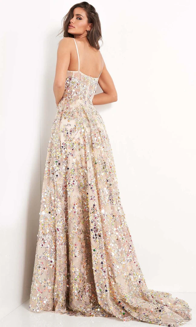 Sparkle like the midnight sky in this romantic Jovani 04630 creation. Festooned with a myriad of shimmering multi-colored sequins, this gown features a sweetheart neckline with spaghetti straps. The sheer bodice and back is structured with corset boning. The A-line skirt glistens as it trails into a fascinating court train. Mesmerize everyone with the romance of this Jovani masterpiece.
