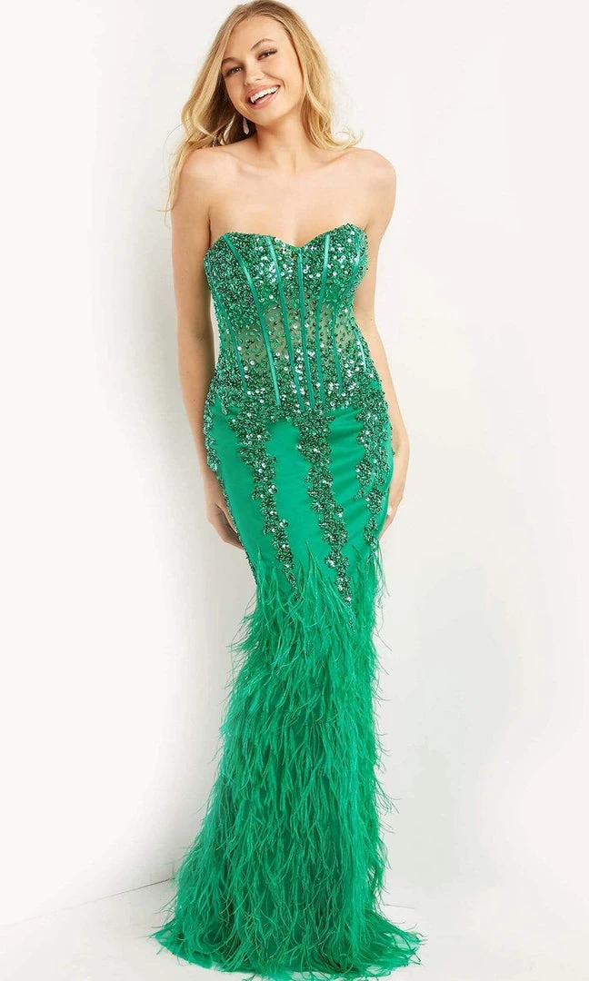 Elevate your style into stunning in this Jovani 08142 creation. Streaming with tonal beaded embellishments, the sheer corset bodice shows a sweetheart neckline. Styled with a sheer back, this piece finishes with a feathered mermaid denouement. Be tailored to perfection in this Jovani masterpiece. Models are wearing the Emerald and Kiwi colors.