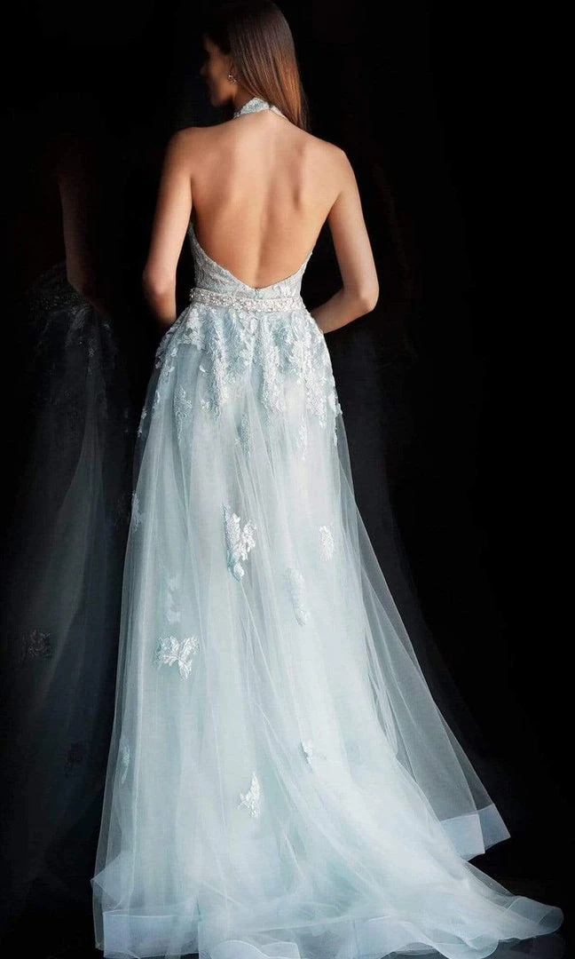 Enter the party and do that walk of a regal beauty in Jovani 60124. Brandishes in a sleeveless, halter V-neckline with scalloped lining. The fitted bodice is ornate with lace appliques and cinched in an embellished belt. Designed with long straight leg pants, this jumpsuit is complemented with a sheer overskirt for added drama. You are a breath of fresh air in this dreamy Jovani look. Model is wearing Light-Blue color. Find more prom dresses!