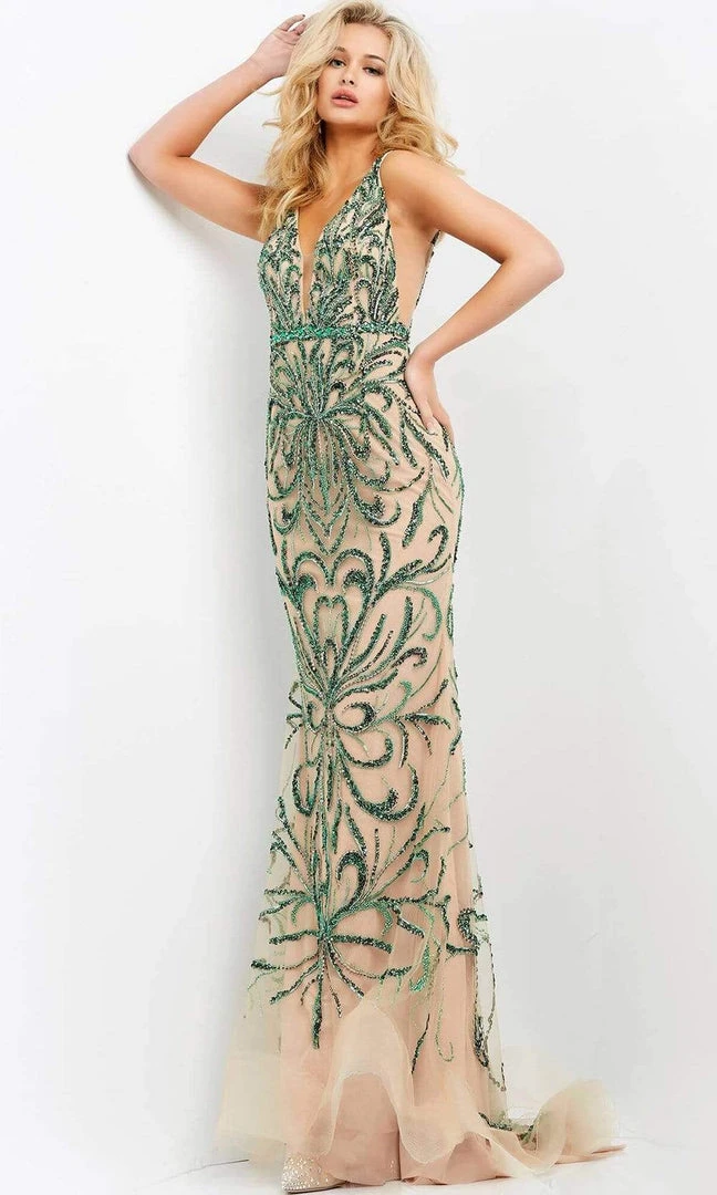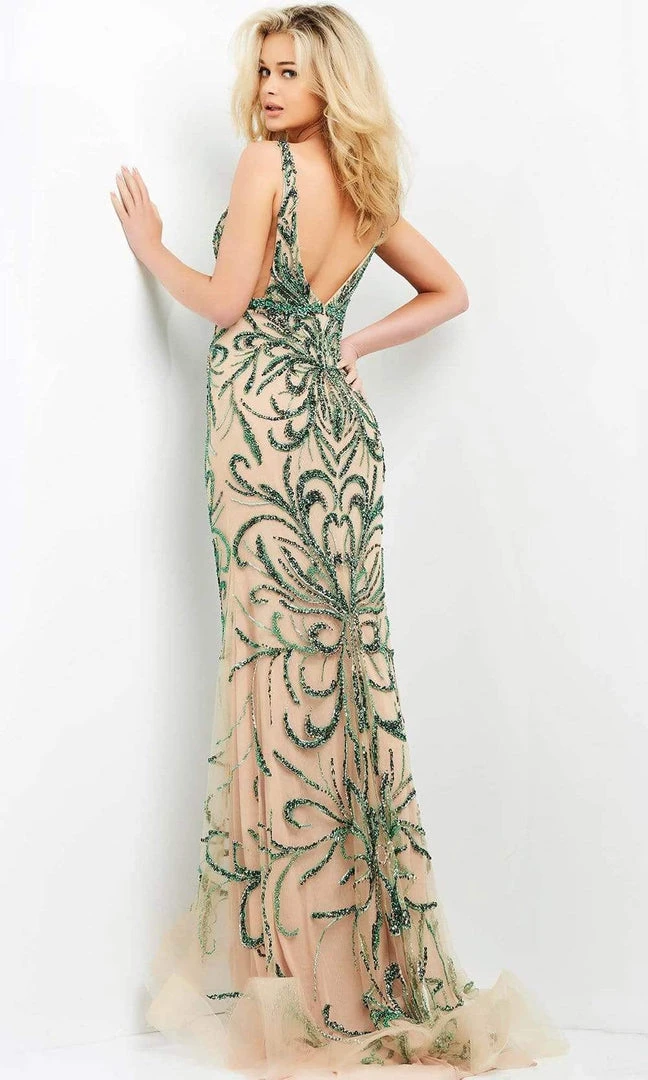 Look incredibly beautiful with this glamorous Jovani 60289 masterpiece. The whole dress is embellished with striking sequins as the fitted bodice showcases a plunging V neckline with sheer panels. The skirt graces a floor length sheath silhouette, finished with horsehair trims and sweep train. Achieve the next level of elegance in this Jovani dress.